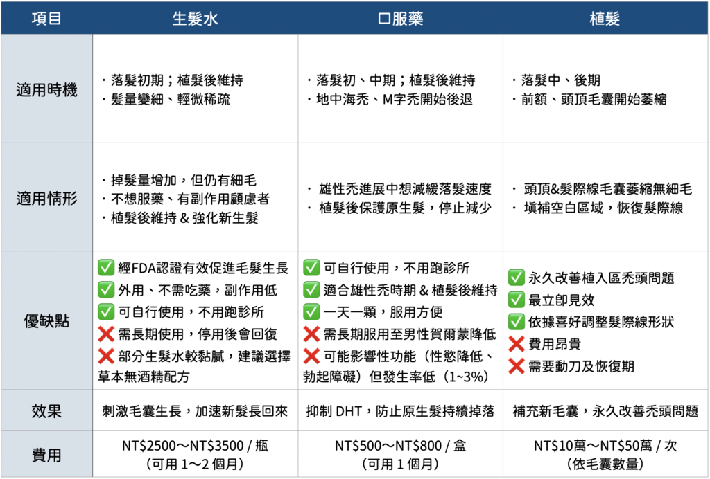 生髮水 vs. 口服藥 vs. 植髮 完整比較表