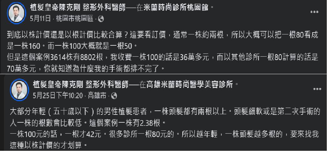 首先在植髮計價方式陳醫師就是以"株"計價,年輕男性一株頭髮都有2根以上