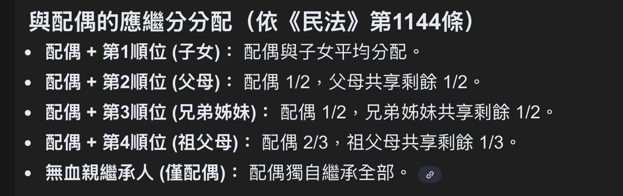 21F:→ mayko: 般來說配偶先拿一半是指這個),剩下的再與繼承人做繼承分配 12/07 21:52