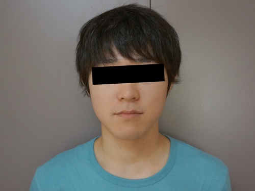 ,直挺挺地望向鏡頭,眼睛部份像是被馬克筆劃一道擋住,像日本報紙刊載