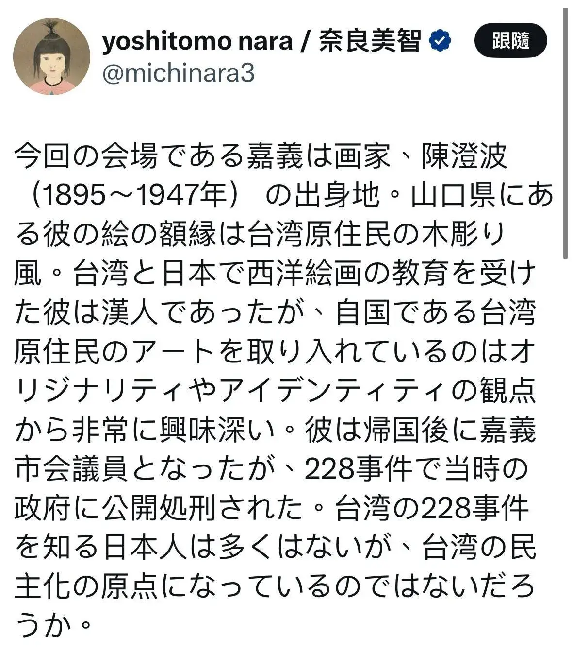 107F:推 petestar : 奈良美智老師一直都是這種愛台灣的人設,很暖 12/14 17:58