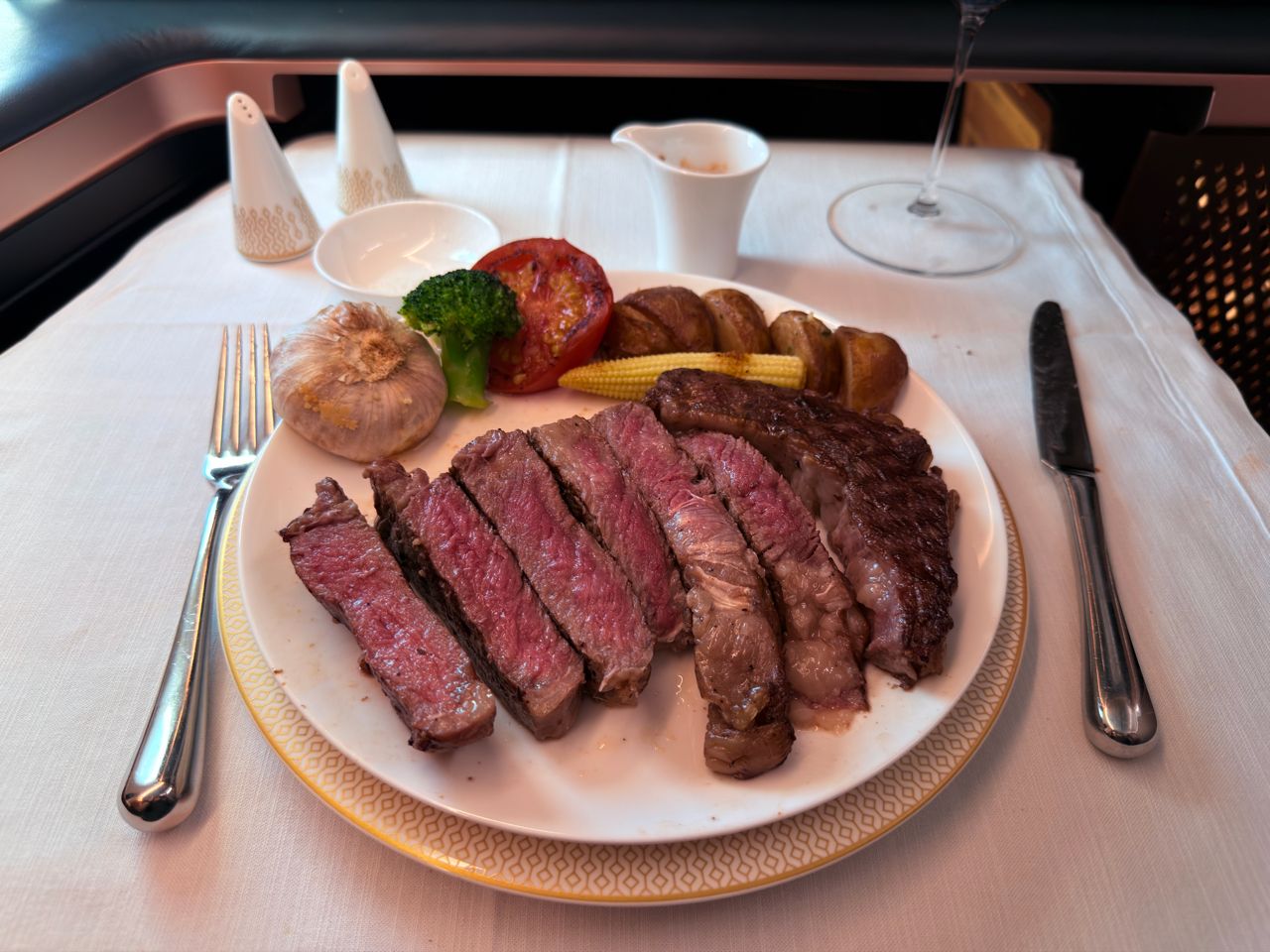 起床用餐時一對一的專屬空服員也提供專業桌邊侍酒服務 ,並介紹酒款 。主餐是招牌16oz頂級牛排 ,非常多汁也沒有過熟像牛肉乾的口感。